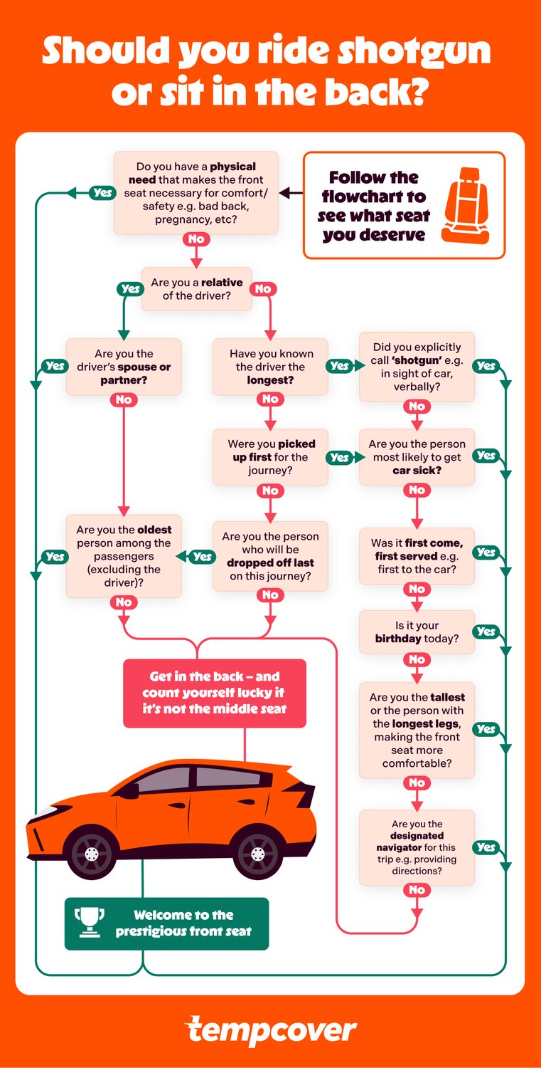 Think you know your Shotgun etiquette? Why not follow our Rules of Shotgun flow chart to decide whether you take the prestigious front seat, or the cheap seats in the back?